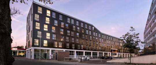 Die vorgefertigten Wohneinheiten ermöglichten ein hohes Arbeitstempo bei diesem Projekt. Teilweise wurden bis zu 16 Wohnungen pro Tag errichtet, sodass trotz der hohen Anforderungen an das Gebäude die Fertigstellung innerhalb von zehn Monaten möglich war. Das Studentenwohnheim besteht aus vorgefertigten Moduleinheiten mit einer Außenabmessung von jeweils 3,2 x 7,7 m und einer Nettogrundfläche von 21 m². Die Einheiten wurden aus einer Stahlrahmenkonstruktion mit Betonboden, sowie Wänden und Decken in Holzrahmenbauweise gefertigt. Jedes Apartment verfügt über eine Küchenzeile und eine eigene Sanitäreinheit mit Dusche, WC und Waschbecken. Um ein abwechslungsreiches Fassadenbild zu erzielen, wurden die Fenster in vier verschiedenen Positionen angeordnet.