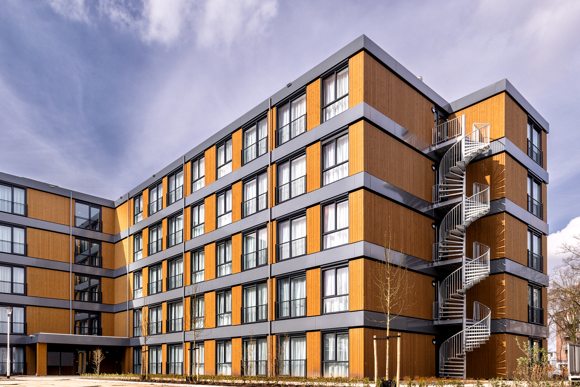 Wat betreft de circulaire bouw: de modulaire woningen zijn circulair ontworpen. In de toekomst kunnen de modules worden gedemonteerd, en alle onderdelen kunnen opnieuw worden gebruikt op een andere locatie. Het gebouw telt 5 lagen en biedt 96 woningen. Daarnaast is er een ontmoetingsruimte met een gezamenlijke keuken. De houten gevel geeft het gebouw een duurzame en fraaie uitstraling.