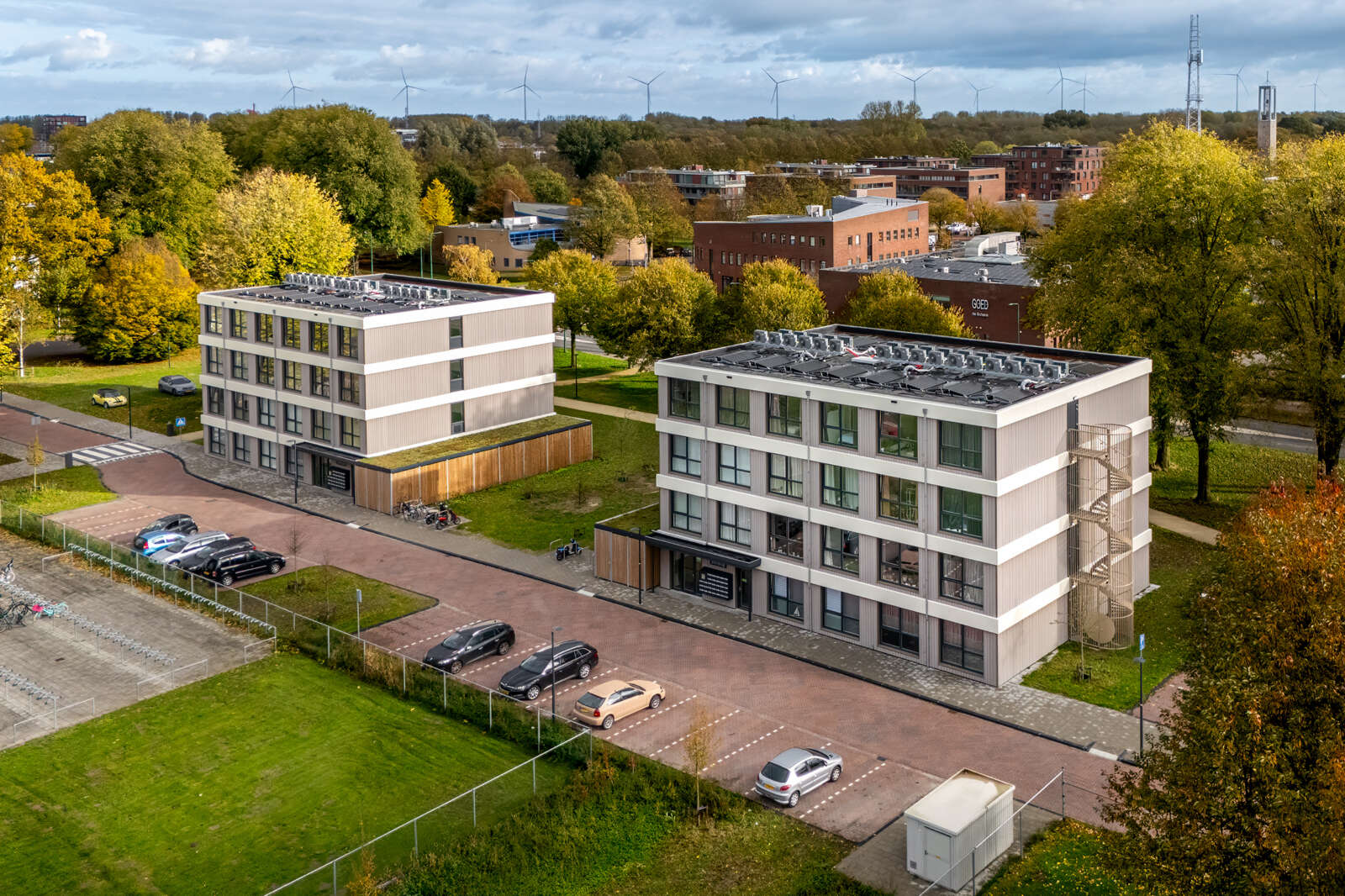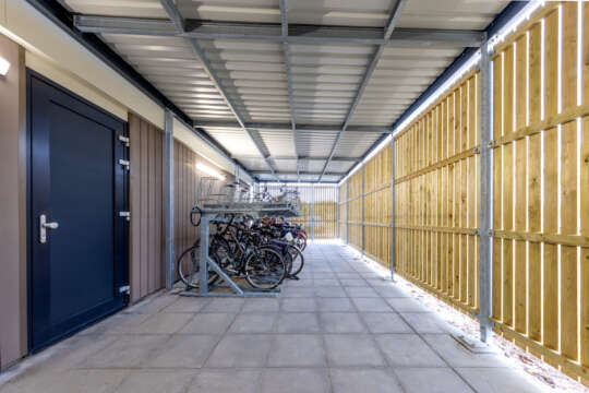 Rondom de gebouwen is een afgesloten fietsenstalling geplaatst. Verder zijn er 50 openbare parkeerplaatsen beschikbaar in de directe omgeving. Omdat de locatie eerder al is gebruikt voor tijdelijke huisvesting, lagen de nutsvoorzieningen al klaar, wat het project aanzienlijk heeft versneld én goedkoper heeft gemaakt.